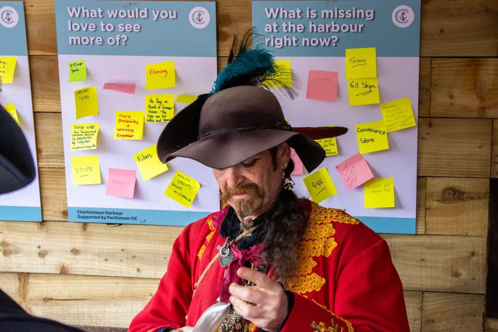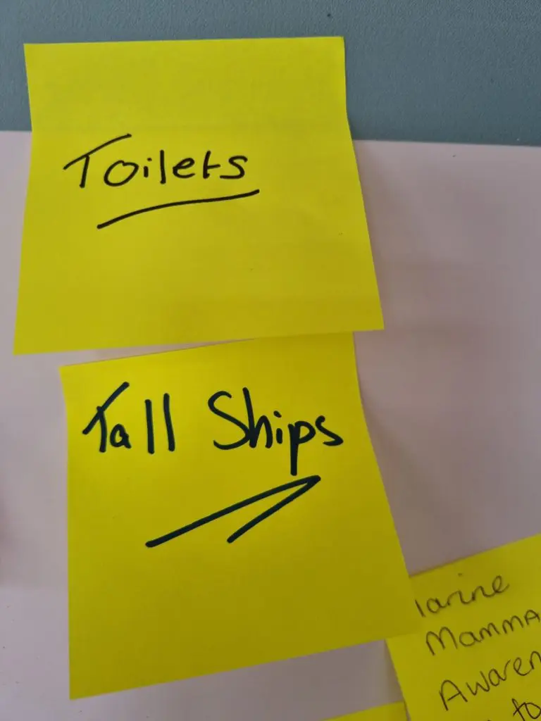 Post-it notes quickly filled the boards – suggestions, questions, one-word ideas, and the occasional strong opinion. At one point, the Pirates of St Piran made their presence known, arriving in force and leaving a wave of “pirates” and “Pirates of St Piran” notes across the display. Clearly the work of one particularly enthusiastic group, but it brought a sense of humour that summed up the morning.